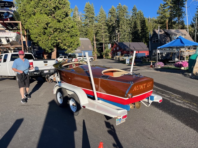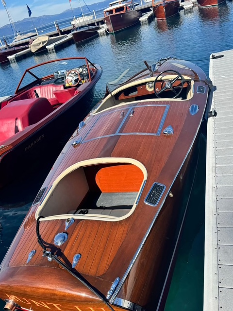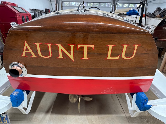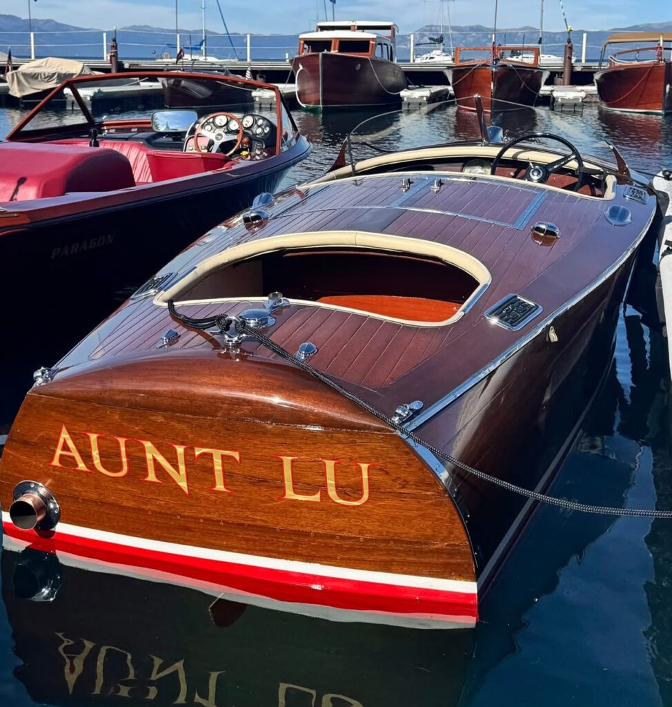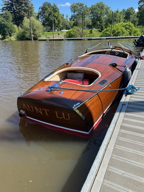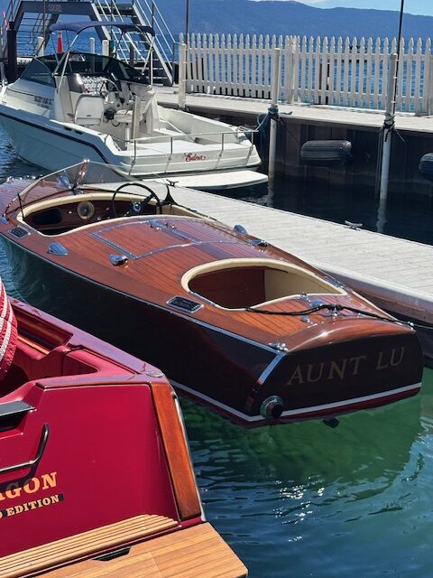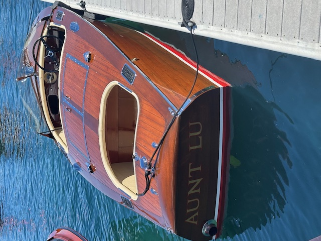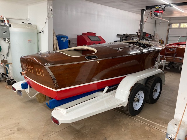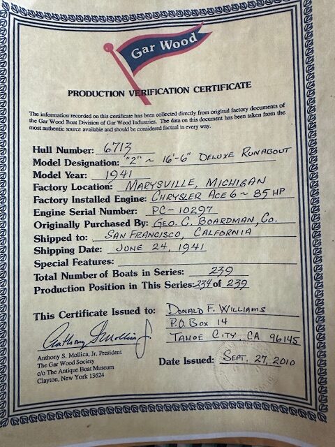 A very rare and attractive Gar Wood model built during the "Trophy Fleet" era between 1937 and 1941. "Aunt Lu" is a 16'6 Model 2 "Deluxe Runabout" and is 1 of only 11 built in 1941. 1941 was a notable year for Gar Wood with some of its best sales and the design changes increased length of each production model by 6". Very similar to the "Custom" model but in a smaller package. Original power came from a 6 cylinder 85HP Chrysler Ace. She has been repowered with a 185HP Chevrolet (Chris Craft conversion) 283cid V8 engine. West System no-soak bottom installed by the late Tony Brown of Western Runabouts. Fresh interior upholstery and finishes throughout. Originally delivered to San Francisco in 1941, she has spent most of her life around Lake Tahoe. Sold complete with a custom fitted single axle trailer along with all records and receipts.