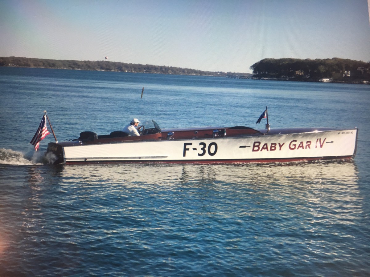 BABY GAR IV is a faithful replica of Garfield Wood's famous Gentleman's Racers. The original BABY GAR IV was built in 1925 by Gar Wood's then business partner, Chris Smith, who built all of Gar Wood's race boats. BABY GAR IV was one of the last of these. At 33 feet, it mirrored the production of Baby Gars in many ways. The hull was similar but the decks were quite different. Gar Wood favored aft steering controls in his Gold Cup boats. Likewise, BABY GAR IV has aft steering in a large two row seat aft and a large single cockpit forward of the engine compartment. BABY GAR IV was built in 1996. It is the only existing Baby Gar Gentleman's Racer powered by a 1920's Vimalert-Liberty 1650 cubic inch V-12 engine, very similar to what powered the originals. Over $70,000 was spent refurbishing the engine alone.